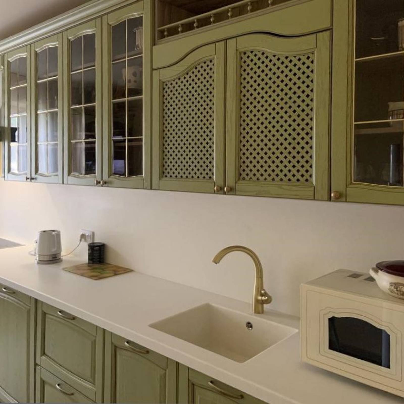 Кухня оливкового цвета может быть выполнена в разных стилях. Такой гарнитур будет гармонировать с классикой, барокко, как на нашем фото, минимализмом, хай-теком, модерном, провансом и кантри — есть много вариантов дизайна кухни. Пример классического оформления на фото ниже.