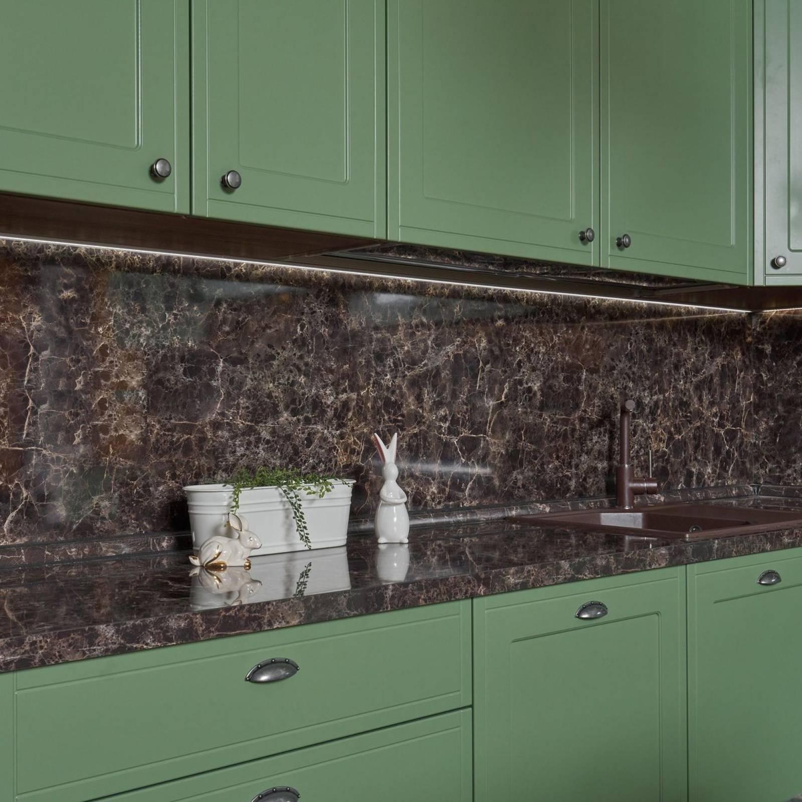 • Коричневый. С коричневым нужно действовать очень осторожно, так как насыщенный шоколадный оттенок имеет особенность затемнять помещение, визуально уменьшая пространство. Это сочетание подходит для кухонь с окнами, выходящими на южную или юго-восточную сторону. Чаще всего оливковому цвету в этом ансамбле отводится роль главного, а коричневому – акцентного. В зеленых тонах может быть мебель, а в шоколадных – столешница, фартук, напольное покрытие, обеденный стол, как на фото. Чтобы добавить света в такую оливковую кухню, используйте глянцевые фасады, зеркала, стеклянные поверхности, а стены делайте светлее на несколько тонов. Можно использовать контрастные аксессуары, как на фото.